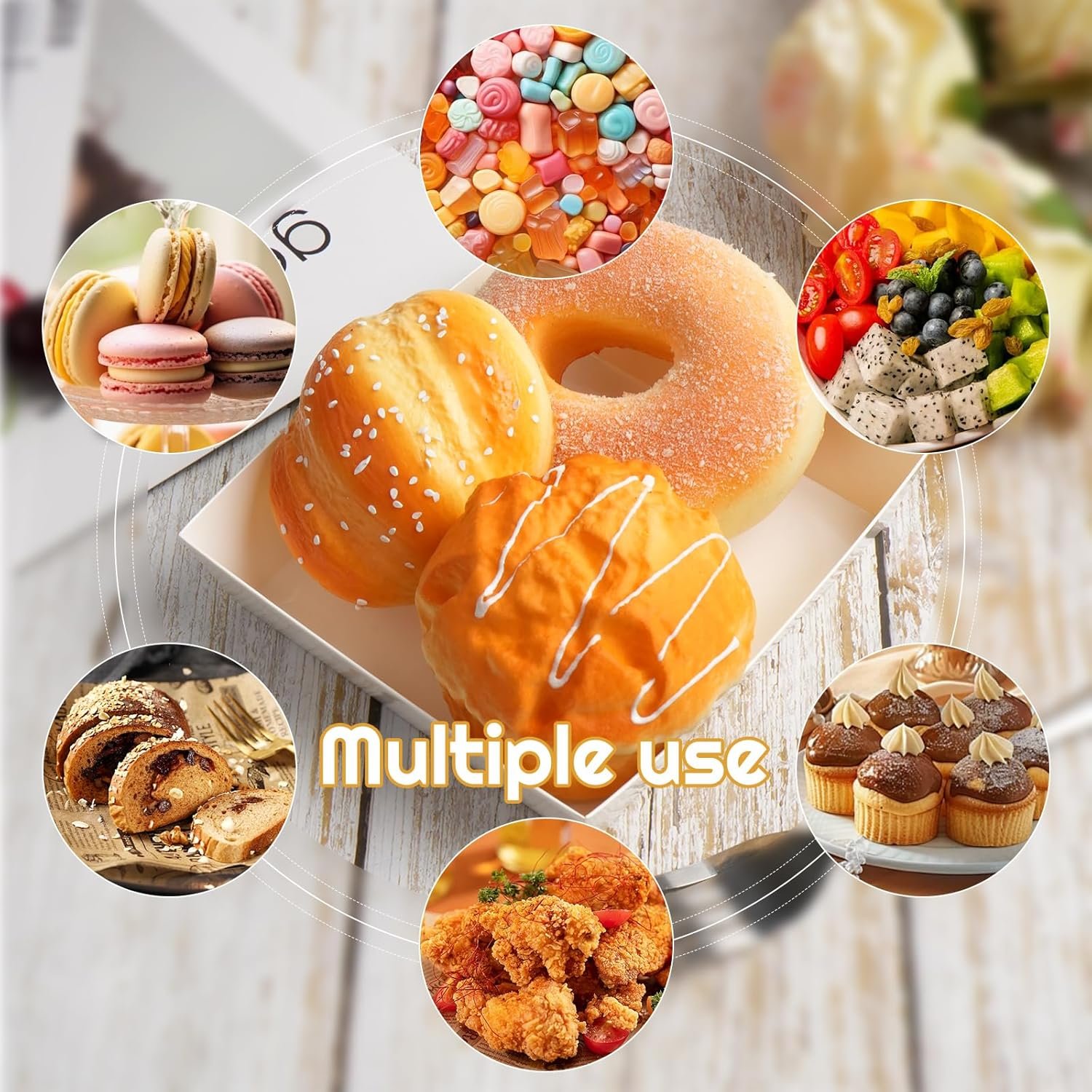 Dank der innovativen wasserdichten und ölbeständigen Innenauskleidung sind diese Papier-Backwaren-Boxen ideal für die Aufbewahrung von frittierten oder feuchten Lebensmitteln. Ob Sie gebackene Waren, Sandwiches oder Charcuterie aufbewahren: Ihre Lebensmittel bleiben frisch und sauber, ohne Auslaufen oder durchweichte Böden.