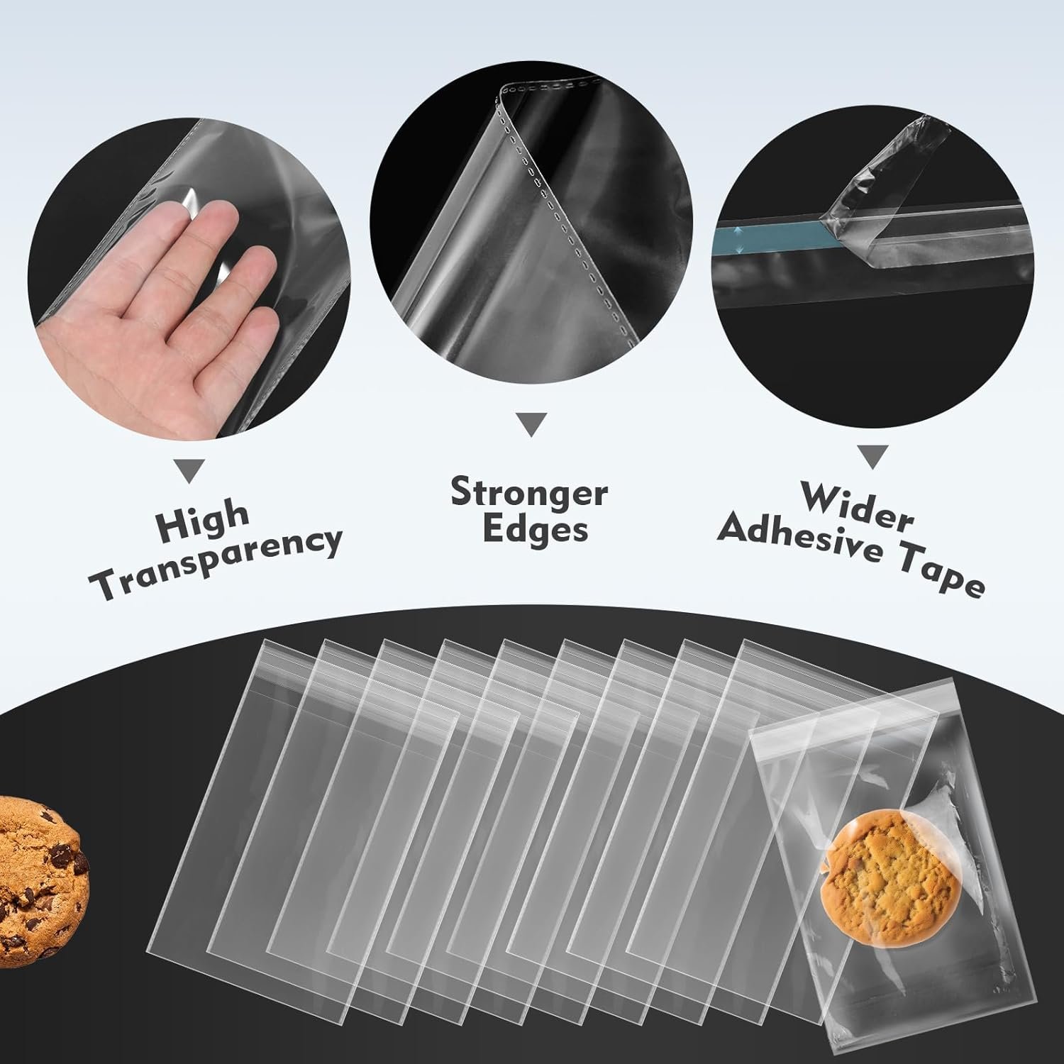 Die extra breite Klebefolie und die gezackten Ränder unserer Zellophanbeutel sorgen nicht nur für einen sicheren und stabilen Verschluss, sondern geben Ihren Produkten auch ein professionelles Aussehen. Diese Eigenschaften sind besonders wichtig, wenn es um die Präsentation Ihrer Artikel geht, sei es in einem Einzelhandelsgeschäft oder bei besonderen Anlässen.