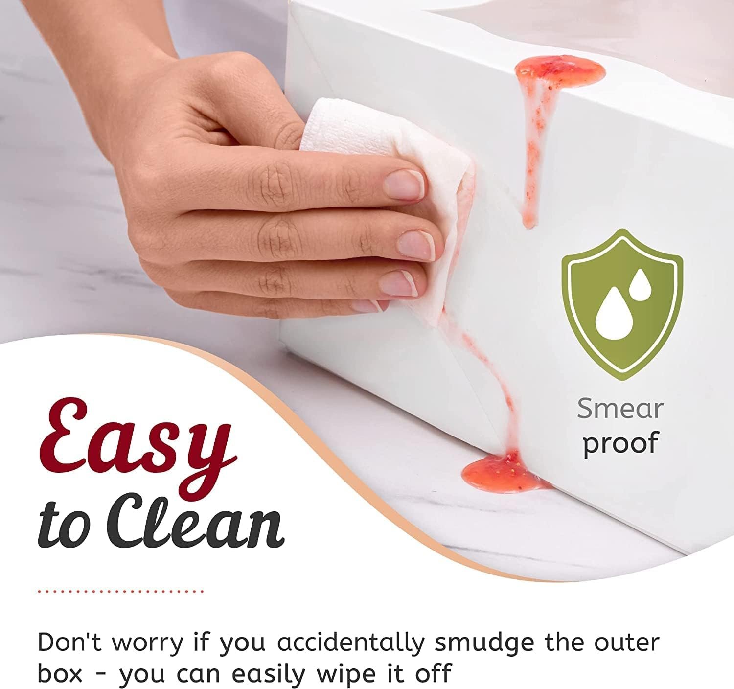 Mit einem sauberen weißen Finish und einem schönen gezackten Fensterdesign verleihen diese 25 cm Kuchenboxen Ihrer Geschäftspräsentation oder hausgemachten Süßigkeiten einen professionellen Touch. Unsere doppelseitigen, fettabweisenden Kuchenböden bieten Ihnen zwei Farboptionen – Weiß oder Gold – die zu jeder Partydekoration oder Designstil passen. Ideal als Backgeschenke oder zur Einweihung!