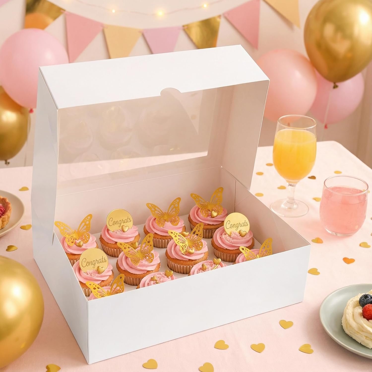 Diese Bäckereiboxen sind perfekt, um Cupcakes, Muffins, Makronen, Kekse und eine Vielzahl von Süßigkeiten zu präsentieren. Ideal für Geburtstagsfeiern, Hochzeiten, Feiertagsfeiern, Verkaufsaktionen und Geschenke, bieten sie stets eine polierte, professionelle Präsentation. Das geräumige, praktische Design ermöglicht es Ihnen, zwölf wunderschön gestaltete Desserts mühelos elegant zu präsentieren.